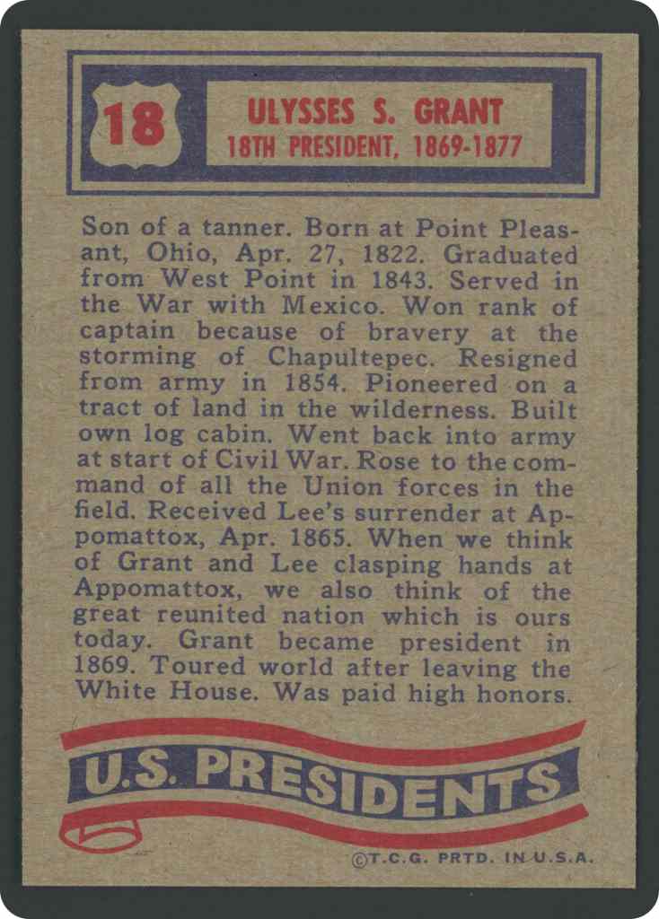 Son of a tanner. Born at Point Pleasant, Ohio, Apr. 27, 1822. Graduated from West Point in 1843. Served in the War with Mexico. Won rank of captain because of bravery at the storming of Chapultepec. Resigned from army in 1854. Pioneered on a tract of land in the wilderness. Built own log cabin. Went back into army at start of Civil War. Rose to the command of all the Union forces in the field. Received Lee’s surrender at Appomattox, Apr. 1865. When think of Grant and Lee clasping hands at Appomattox, we also think of the great reunited nation which is ours today. Grant became president in1869. T outed world after leaving the White House. Was paid high honors.