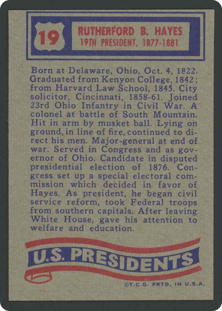 Born at Delaware, Ohio , Oct. 4, 1822. Graduated from Kenyon College, 1842; from Harvard Law School, 1845. City soliciror. Cincinnati, 1858-61.Joined 23rd Ohio Infantry in Civil War. A colonel at battle of South Mountain. Hit in arm by musket ball. Lying on ground, in line of fire, continued to direct his men. Major-general at end of war. Served in confress and as governor of Unio. Candidate in disputed presidential clection of 1876, Congress set up a special electoral commission which decided in favor of Hayes. As president, he began civil service reform, took Federal troops from southern capitals. After leaving White House, gave his attention to weltare and education.