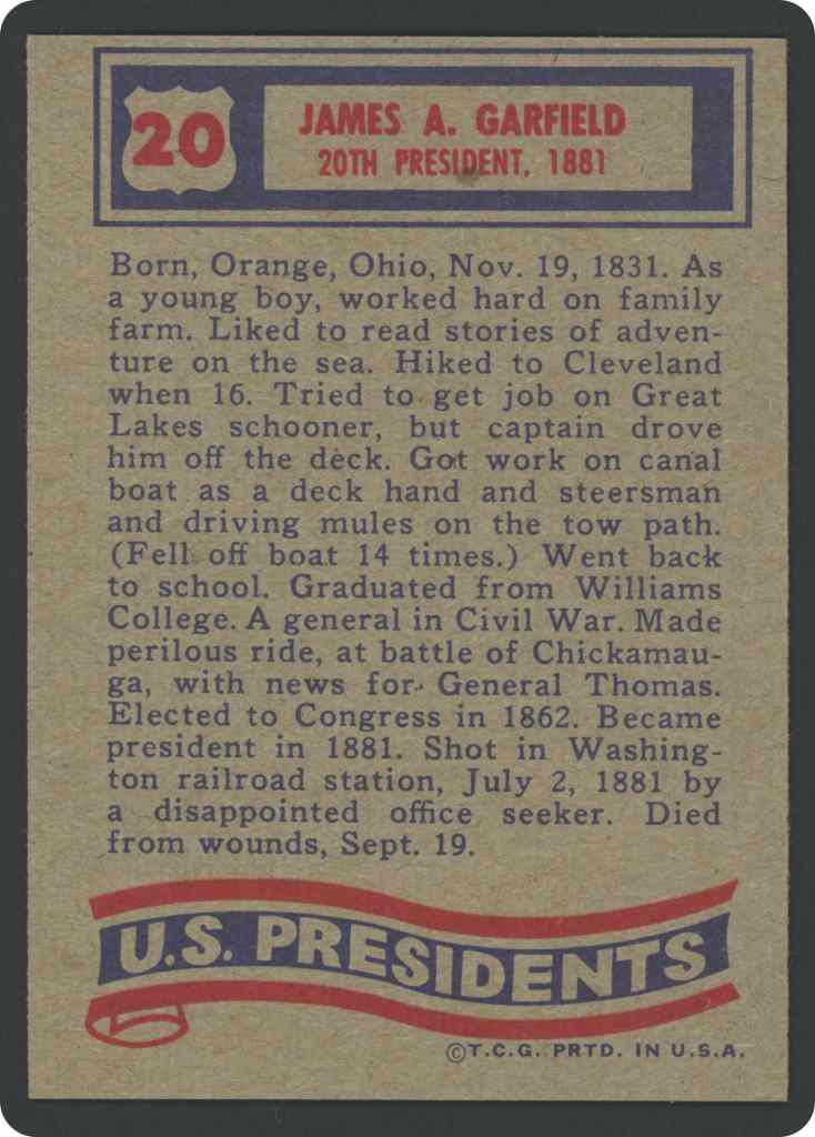 Born, Orange, Ohio, Nov. 19, 1831. As a young boy, worked hard on family farm. Liked to read stories of adventure on the sea. Hiked to Cleveland when 16. Tried to get job on Great Lakes schooner, but captain drove him off the deck. Got work on canal boat as a deck hand and steersman and driving mules on the tow path. (Fell off boat 14 times.) Went back to school. Graduated from Williams College. A general in Civil War. Made perilous ride, at battle of Chickamauga, with news for General Thomas. Elected to Congress in 1862. Became president in 1881. Shot in Washington railroad station, July 2, 1881 by a disappointed office seeker. Died from wounds, Sept. 19.