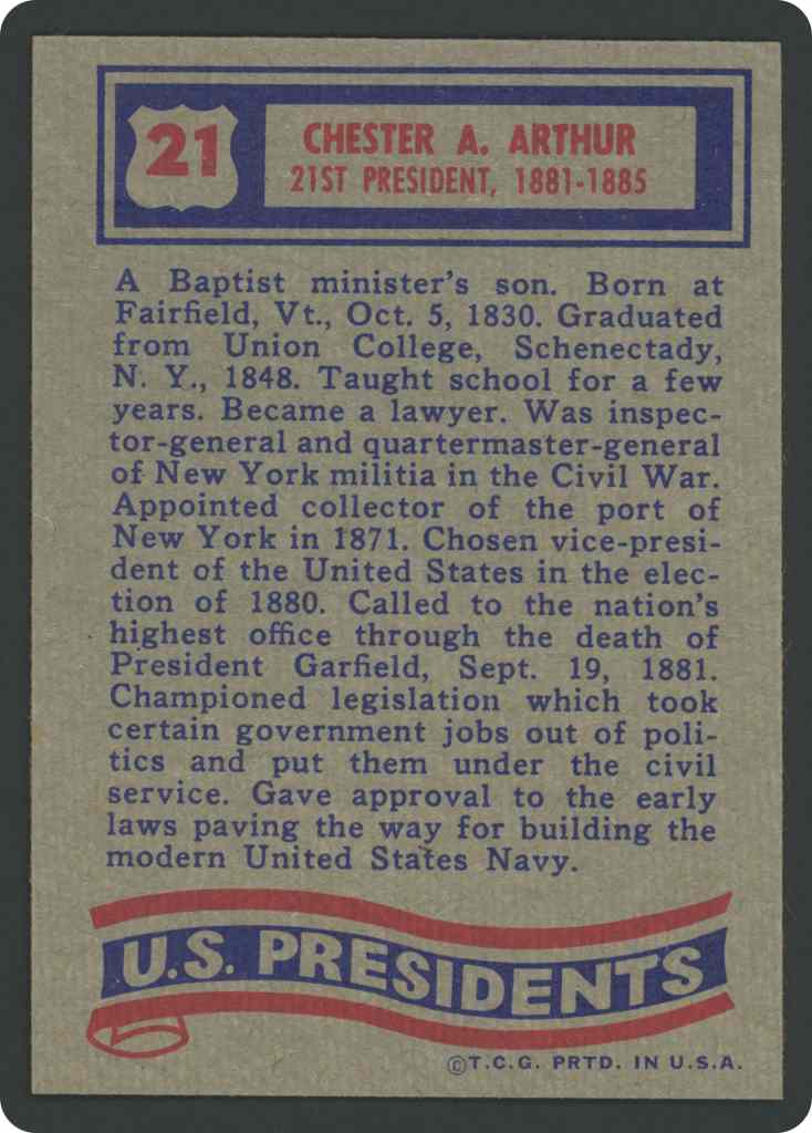 A Baptist minister’s son. Born at Fairfield, Vt., Oct. 5, 1830. Graduated from Union College, Schenectady, N. Y., 1848. Taught school for a few years. Became a lawyer. Was inspector-general and quartermaster-general of New York militia in the Civil War. Appointed collector of the port of New York in 1871. Chosen vice-president of the United States in the election of 1880. Called to the nation’s highest office through the death of President Garfield, Sept.19, 1881. Championed legislation which took certain government jobs out of politics and put them under the civil service. Gave approval to the early laws paving the way for building the modein United States Navy.