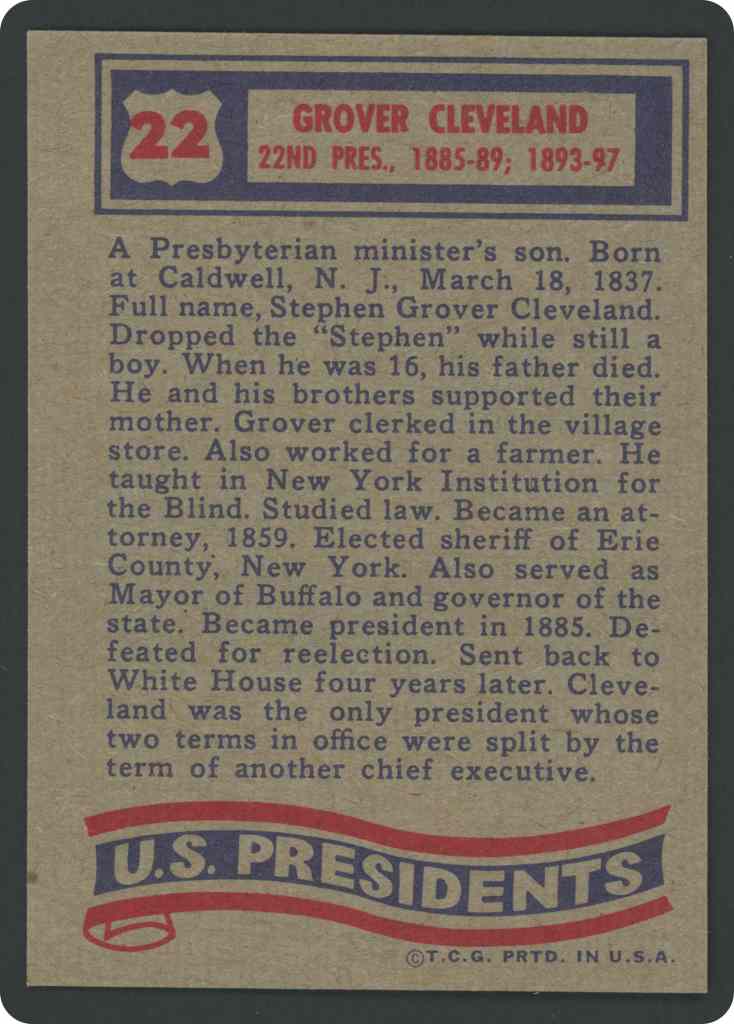 A Presbyterian minister’s son. Born at Caldwell, N. J., March 18, 1837. Full name, Stephen Grover Cleveland. Dropped the “Stephen” while still a boy. When he was 16, his father died. He and his brothers supported their mother. Grover clerked in the village store. Also worked for a farmer. He taught in New York Institution for the Blind. Studied law. Became an attorney, 1859. Elected sheriff of Erie County, New York. Also served as Mayor of Buffalo and governor of the state. Became president in 1885. Defeated for reelection. Sent back to White House four years later. Cleveland was the only president whose two terms in office were split by the term of another chief executive.