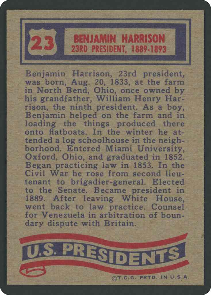 Benjamin Harrison, 23rd president, born, Aug. Z0, 1833, at the farn in North Bend, Ohio, once owned by his grandfather, William Henry Harrison, the ninth president. As a boy, Benjamin helped on the farm and in loading the things produced there onto flatboats. In the winter he attended a log schoolhouse in the neighborhood. Entered Miami University. Oxford, Ohio, and graduated in 1852. Began practicing law in 1853. In the Civil War he rose from second lieutenant to brigadier-general. Elected to the Senate. Became president i1889. After leaving White House, went back to law practice. Counsel for Venezuela in arbitration of boundary dispute with Britain.