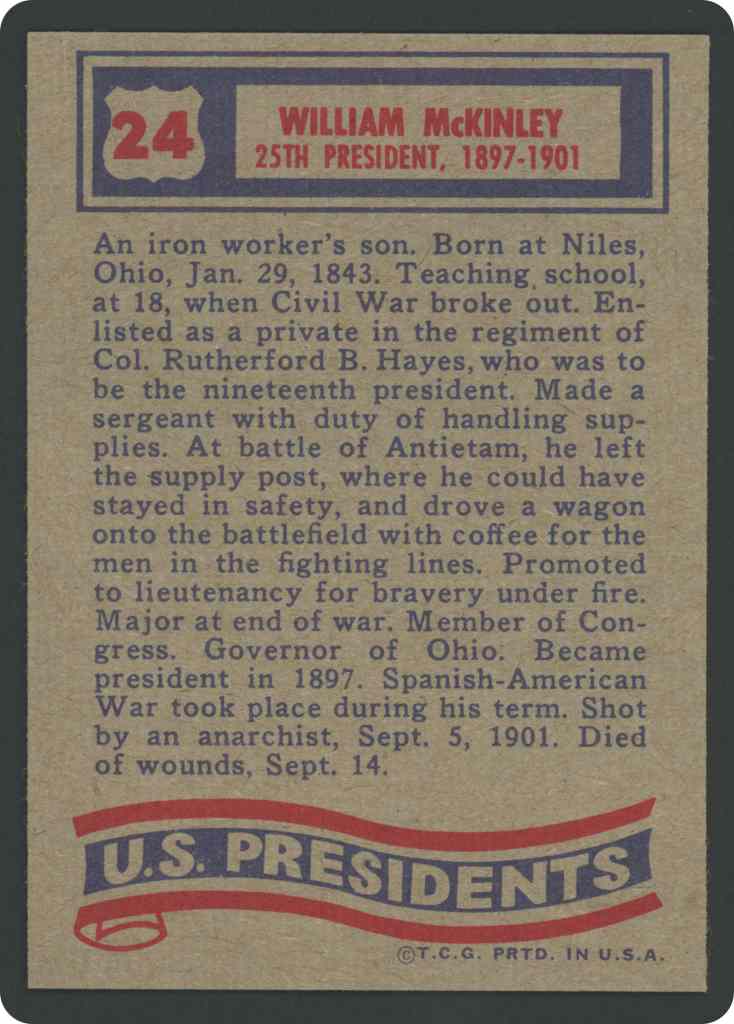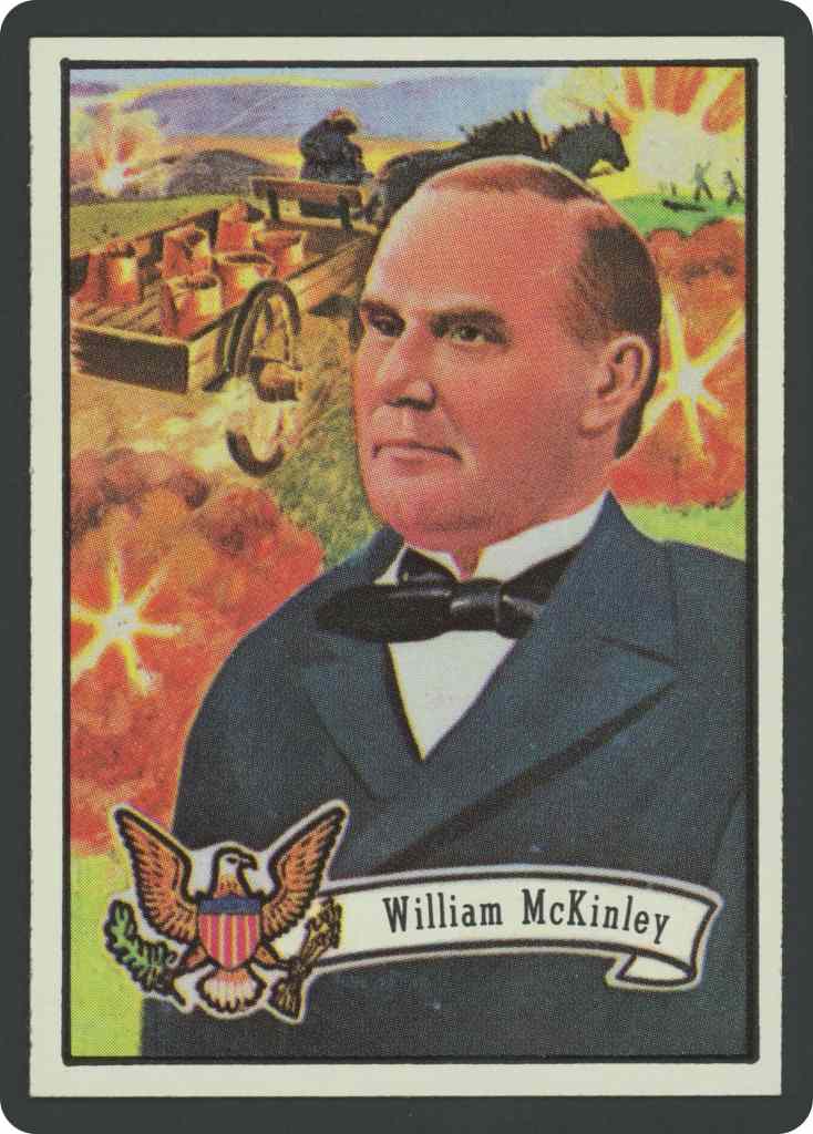 An iron worker’s son. Born at Niles, Ohio, Jan. 29, 1843. Teaching school, at 18, when Civil War broke out. Enlisted as a private in the regiment of Col. Rutherford B. Hayes, who was to be the nineteenth president. Made a sergeant with duty of handling supplies. At battle of Antietam, he left the supply post, where he could have stayed in safety, and drove a wagon onto the battlefield with coffee for the men in the fighting lines. Promoted to lieutenancy for bravery under fire. Major at end of war. Member of Congress. Governor of Ohio. Became president in 1897. Spanish-American War took place during his term. Shot by an anarchist, Sept. 5, 1901. Died of wounds, Sept. 14.