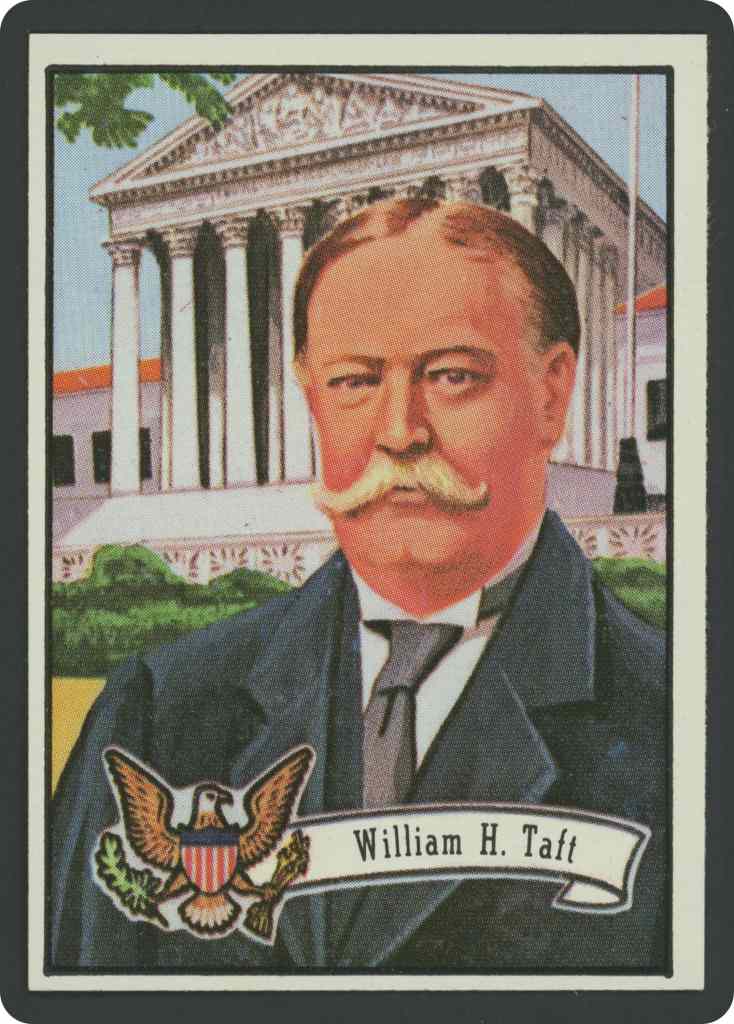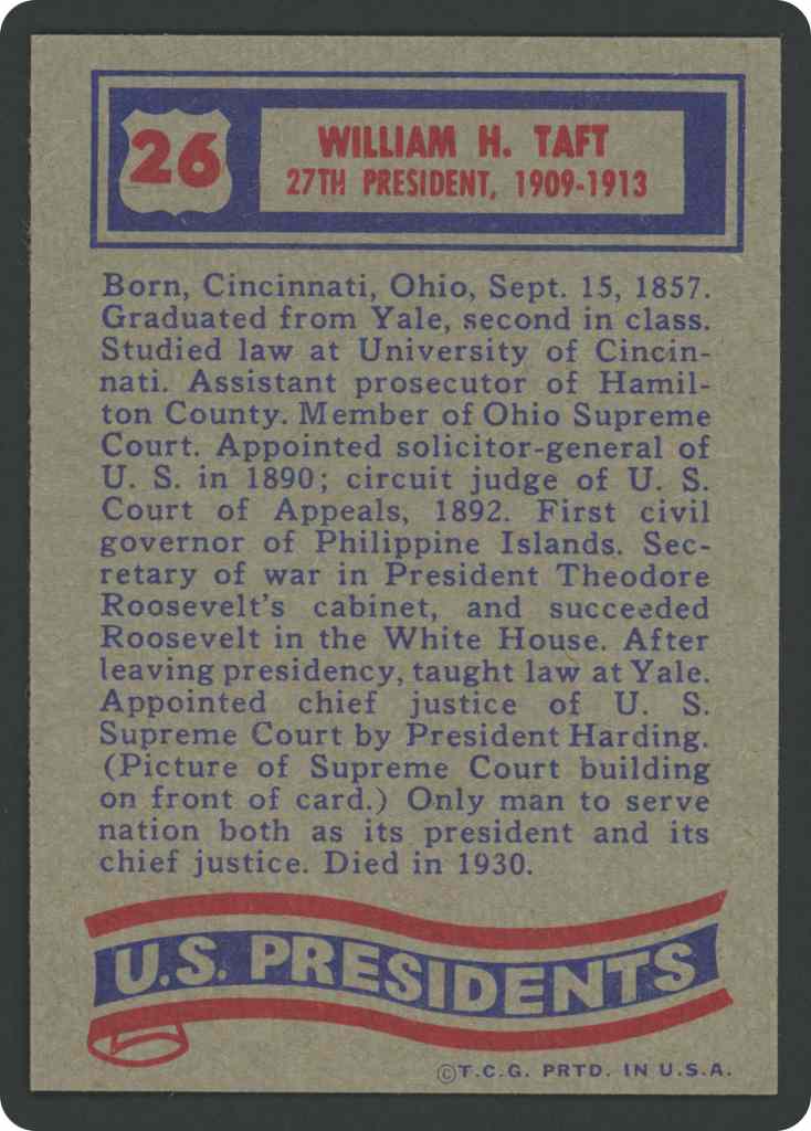 Born, Cincinnati, Ohio, Sept. 15, 1857. Graduated from Yale, second in class. Studied law at University of Cincinnati. Assistant prosecutor of Hamilton County. Member of Ohio Supreme Court. Appointed solicitor general of U. S. in 1890; circuit judge of U.S. Court of Appeals, 1892. First civil governor of Philippine Islands. Secretary of war in President Theodore Roosevelt’s cabinet, and succeeded Roosevelt in the White House. After leaving presidency, taught law at Yale. Appointed chief justice of U.S. Supreme Court by President Harding. (Picture of Supreme Court building on front of card.) Only man to serve nation both as its president and its chief justice. Died in 1930.