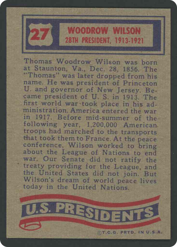 Thomas Woodrow Wilson was born at Staunton, Va., Dec. 28, 1856. The “Thomas” was later dropped from his name. He was president of Princeton U. and governor of New Jersey. Became president of U. S. in 1913. The first world war took place in his administration. America entered the war in 1917. Before mid-summer of the following year, 1,200,000 American troops had marched to the transports that took them to France. At the peace conference, Wilson worked to bring about the League of Nations to end war. Our Senate did not ratify the treaty providing for the League, and the United States did not join. But Wilson’s dream of world peace lives today in the United Nations.