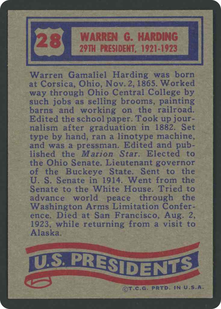 Warren Gamaliel Harding was born at Corsica, Ohio, Nov. 2, 1865. Worked way through Ohio Central College by such jobs as selling brooms, painting barns and working on the railroad. Edited the school paper. Took up journalism after graduation in 1882. Set type by hand, ran a linotype machine, and was a pressman. Edited and published the Marion Star. Elected to the Ohio Senate. Lieutenant governor of the Buckeye State. Sent to the U.S. Senate in 1914. Went from the Senate to the White House. Tried to advance world peace through the Washington Arms Limitation Conference. Died at San Francisco, Aug. 2, 1923, while returning from a visit to Alaska.