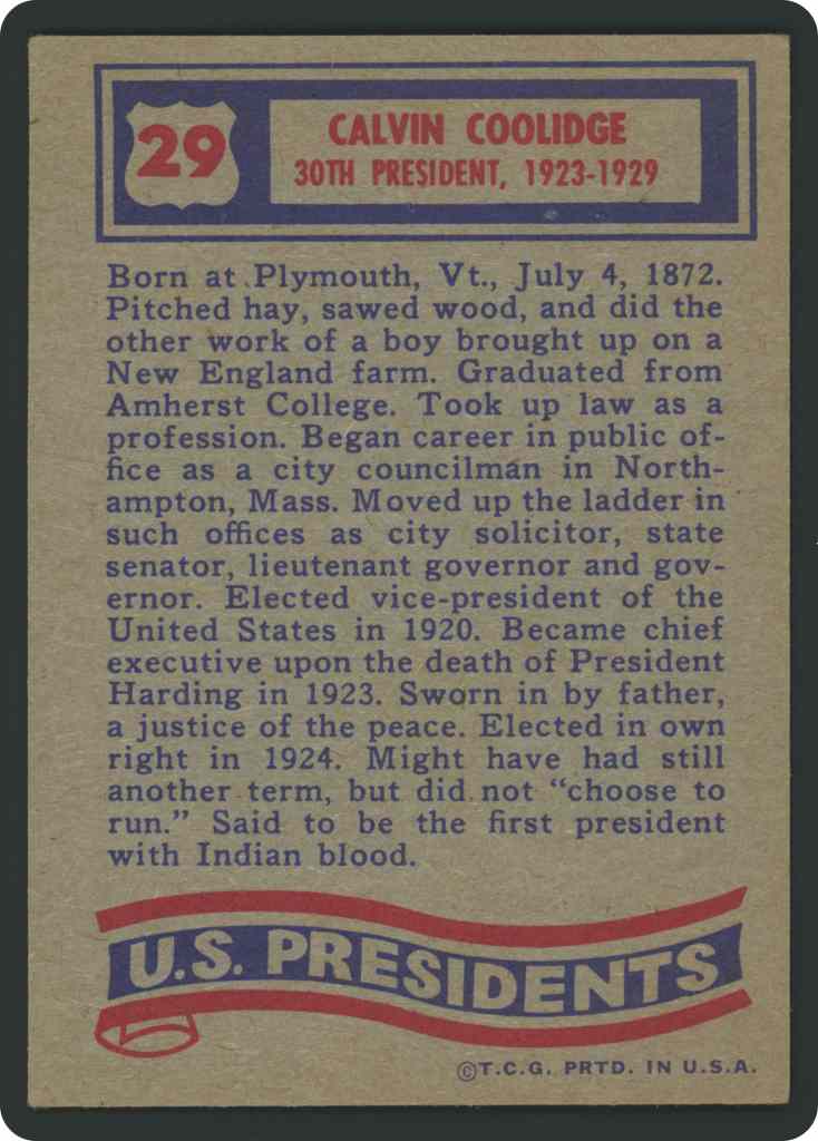 Born at Plymouth, Vt., July 4, 1872. Pitched hay, sawed wood, and did the other work of a boy brought up on a New England farm. Graduated from Amherst College. Took up law as a profession. Began career in public office as a city councilman in Northampton, Mass. Moved up the ladder in such offices as city solicitor, state senator, lieutenant governor and governor. Elected vice-president of the United States in 1920. Became chief executive upon the death of President Harding in 1923. Sworn in by father, a justice of the peace, Elected in own right in 1924. Might have had still another term, but did not “choose to run.” Said to be the first president with Indian blood.