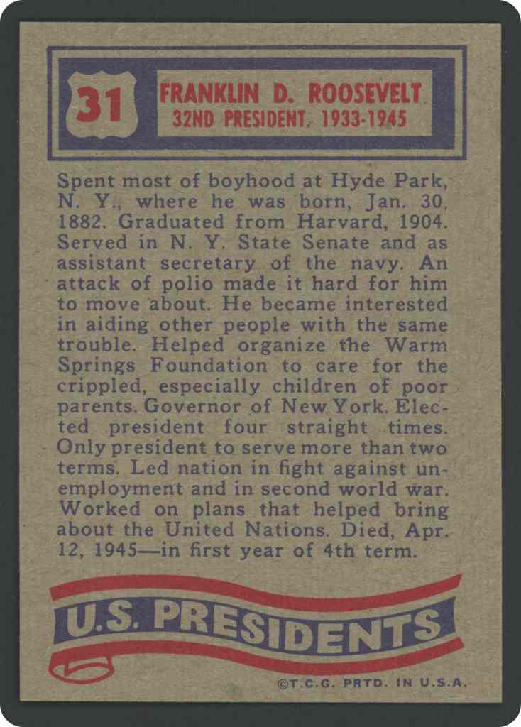 Spent most of boyhood at Hyde Park, N.Y. where he was born, Jan. 30, 1882. Graduated from Harvard, 1904. Served in N. Y. State Senate and as assistant secretary of the navy. An attack of polio made it hard for him to move about. He became interested in aiding other people with the same trouble. Helped organize the Warm Springs Foundation to care for the crippled, especially children of poor parents. Governor of New York. Elected president four straight times. Only president to serve more than two terms. Led nation in fight against unemployment and in second world war. Worked on plans that helped bring about the United Nations. Died, Apr. 12, 1945-in first year of 4th term.