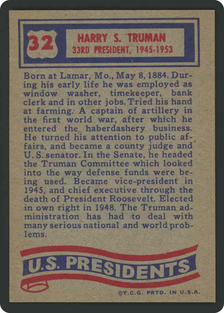 Born at Lamar, Mo., May 8, 1884. During his early life he was employed as window washer, timekeeper, bank clerk and in other jobs. Tried his hand at farming. A captain of artillery in the first world war, after which he entered the haberdashery business. He turned his attention to public affairs, and became a county judge and U.S. senator. In the Senate, he headed the Truman Committee which looked into the way defense funds were being used. Became vice president in 1945, and chief executive through the death of President Roosevelt. Elected in own right in 1948. The Truman administration has had to deal with many serious national and world problems.