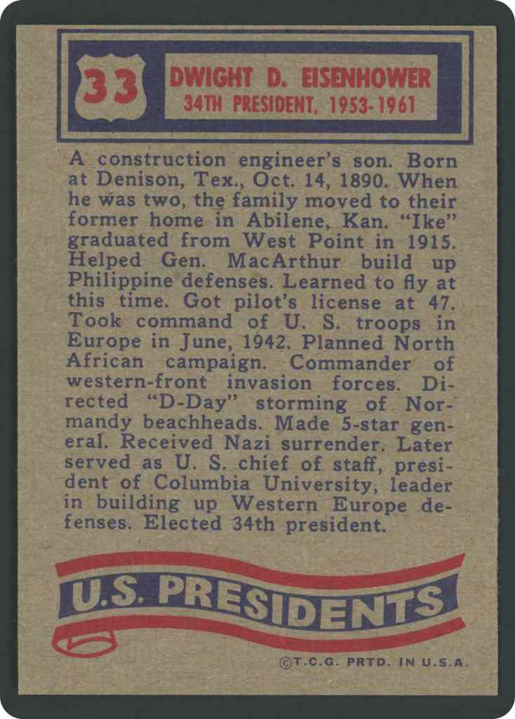 A construction engineer’s son. Born at Denison, Tex., Oct. 14, 1890. When he was two, the family moved to their former home in Abilene, Kan. “Ike” graduated from West Point in 1915. Helped Gen. MacArthur build up Philippine defenses. Learned to fly at this time. Got pilot’s license at 47. Took command of U. S. troops in Europe in June, 1942. Planned North African campaign. Commander of western-front invasion forces. Directed “D-Day” storming of Normandy beachheads. Made 5-star general. Received Nazi surrender. Later served as U. S. chief of staff, president of Columbia University, leader in building up Western Europe defenses. Elected 34th president.