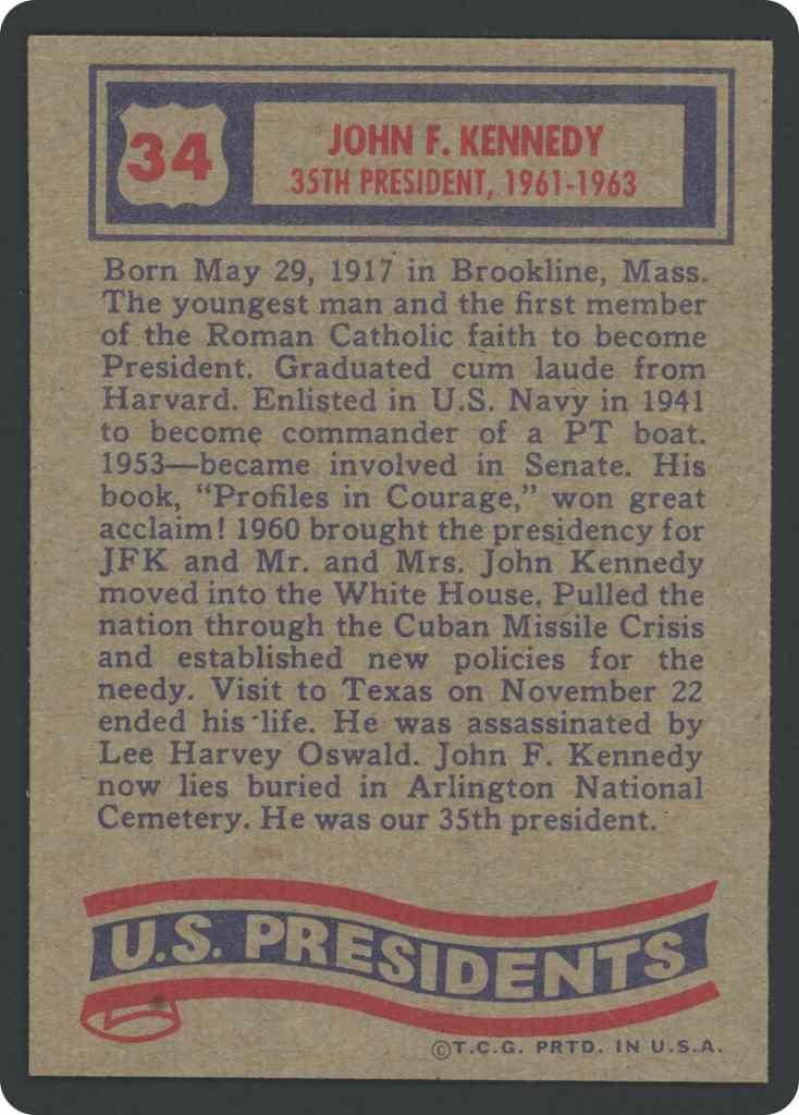 Born May 29, 1917 in Brookline, Mass. inc voungest man and the hrst member of the Roman Catholic faith to become President. Graduated cum laude from Harvard. Enlisted in U.S. Navy in 1941 to become commander of a PT boat. 1953 became involved in Senate. His book, “Profiles in Courage,” won great acclaim! 1960 brought the presidency for JFK and Mr. and Mrs. John Kennedy moved into the White House. Pulled the nation through the Cuban Missile Crisis and established new policies for the needy. Visit to Texas on November 22 ended his life. He was assassinated by Lee Harvey Oswald. John F. Kennedy now lies buried in Arlington National Cemetery. He was our 35th president.