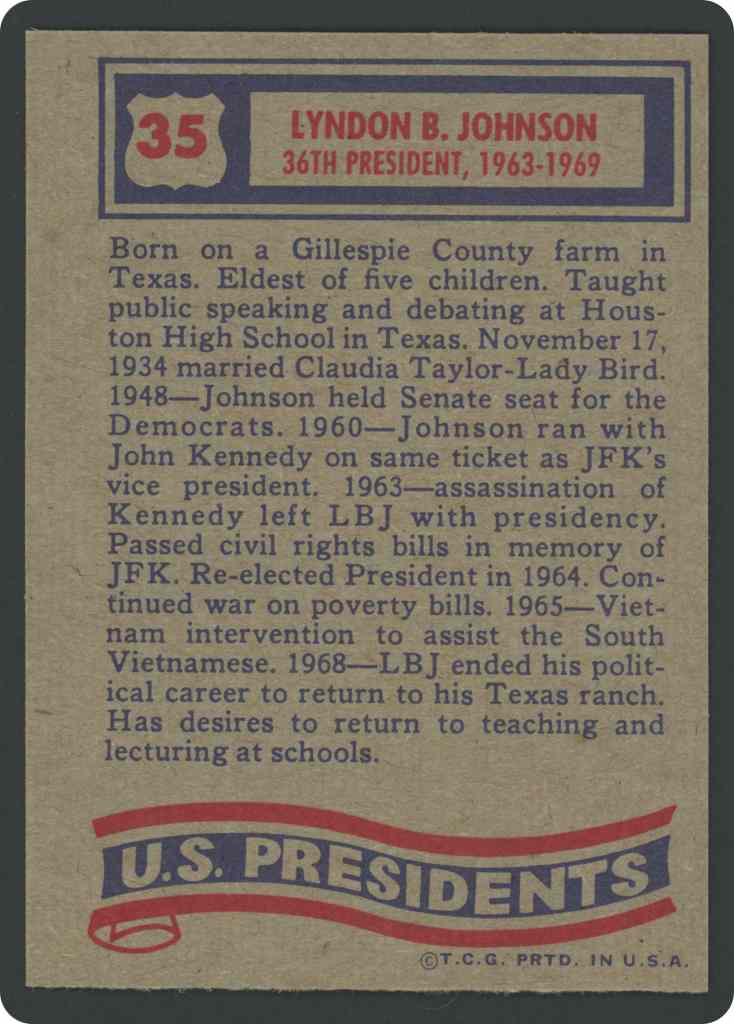Born on a Gillespie County farm in Texas. Eldest of five children. Taught public speaking and debating at Houston High School in Texas. November 17, 1934 married Claudia Taylor-Lady Bird. 1948-Johnson held Senate seat for the Democrats. 1960-Johnson ran with John Kennedy on same ticket as JFK’s vice president. 1963-assassination of Kennedy left LBJ with presidency. Passed civil rights bills in memory of JFK. Re-elected President in 1964. Continued war on poverty bills. 1965-Vietnam intervention to assist the South Vietnamese. 1968-LBJ ended his political career to return to his Texas ranch. Has desires to return to teaching and lecturing at schools.
