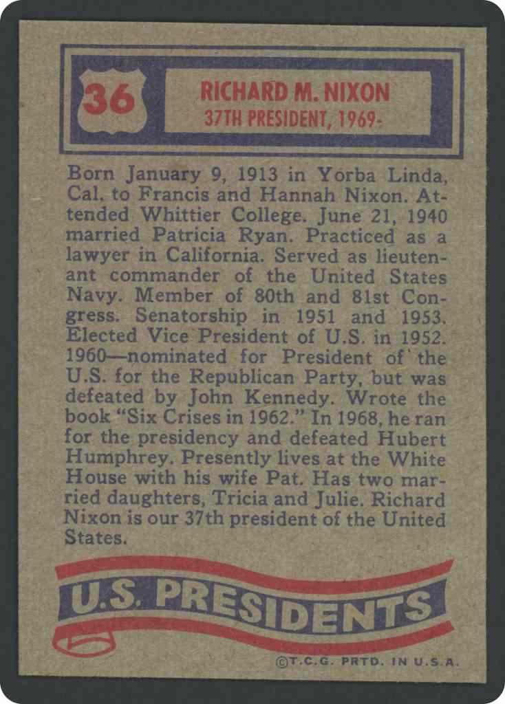 Born January 9, 1913 in Yorba Linda, Cal. to Francis and Hannah Nixon. Attended Whittier College. June 21, 1940 married Patricia Ryan. Practiced as a lawyer in California. Served as lieutenant commander of the United States Navy. Member of 80th and 81st Congress. Senatorship in 1951 and 1953. Elected Vice President of U.S. in 1952. 1960-nominated tor President of the U.S. for the Republican Party, but was defeated by John Kennedy, Wrote the book “Six Crises in 1962.” In 1968, he ran for the presidency and defeated Hubert Humphrey, Presently lives sat the White House with his wife Pat. Has two married daughters, Tricia and Julie. Richard Nixon is our 37th president of the United States.