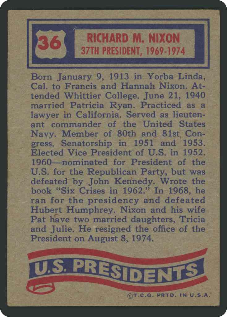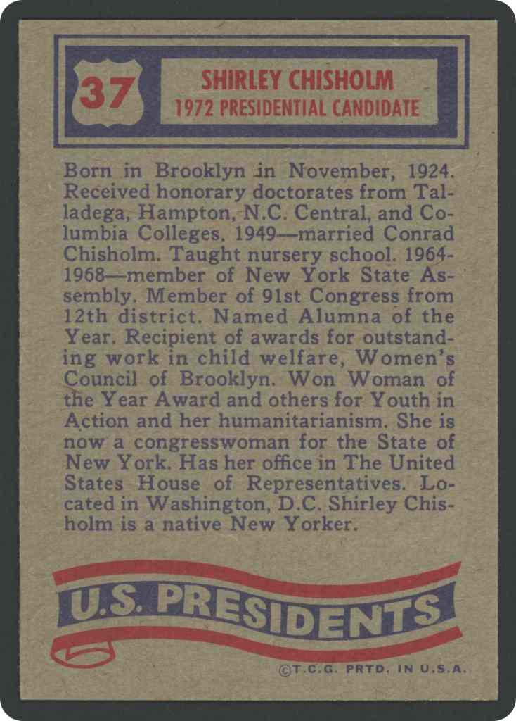 In a momentous release in 1972, a 43-card set was unveiled, showcasing all US Presidents from the venerable George Washington to the illustrious Richard M. Nixon. The set was not limited to presidents alone, as it also featured 7 candidates for the esteemed position of U.S. President. Adding to its appeal, the set included 15 fold-out mock posters of past presidents, providing a captivating and comprehensive visual journey through American political history. Notably, in 1976, Topps, the masterminds behind this esteemed collection, made a bold decision to shake things up. They sought to alter the card numbering by reissuing Richard M. Nixon’s card to incorporate his truncated term, thereby birthing two intriguing variations of the same card. To further astonish collectors and aficionados, Topps introduced Gerald R. Ford to claim card number 37 spot, the very same number held by Shirley Chisholm’s card in the original 1972 set. This unprecedented move by Topps, deliberately resequencing the cards years after the initial release, stands as a rare occurrence in the esteemed annals of the trading card industry, adding to the allure and mystique of this historic collection.