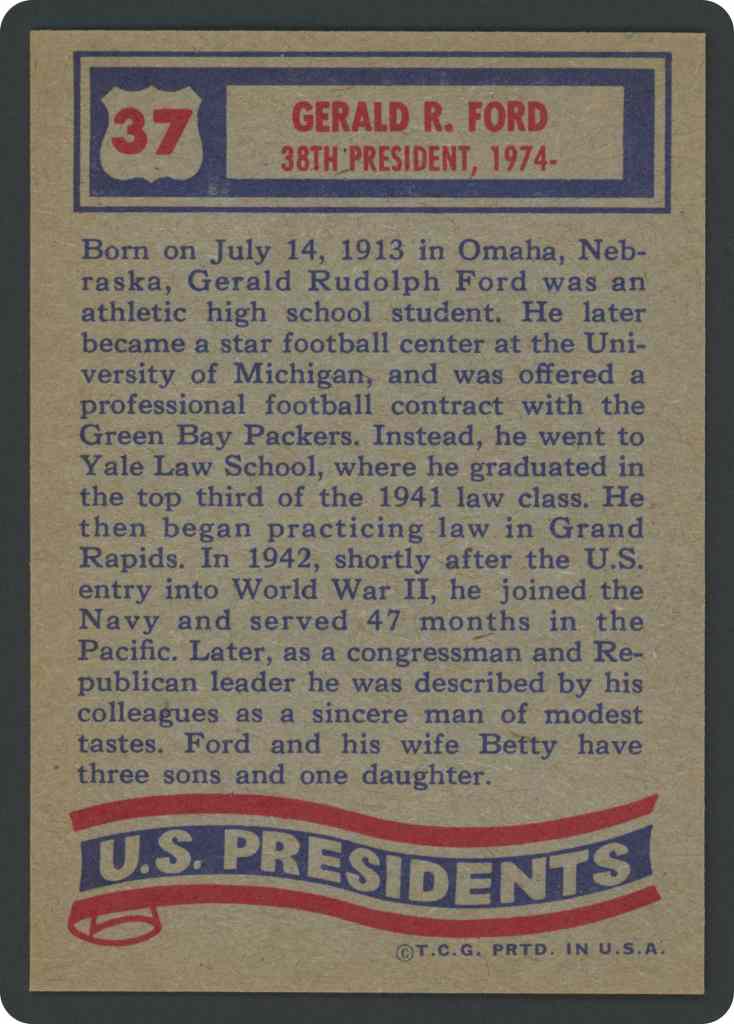 Born on July 14, 1913 in Omaha, Nebraska, Gerald Rudolph Ford was an athletic high school student. He later became a star football center at the University of Michigan, and was offered a professional football contract with the Green Bay Packers. Instead, he went to Yale Law School, where he graduated in the top third of the 1941 law class. He then began practicing law in Grand Rapids. In 1942, shortly after the U.S. entry into World War II, he joined the Navy and served 47 months in the Pacific. Later, as a congressman and Republican leader he was described by his colleagues as a sincere man of modest tastes. Ford and his wife Betty have three sons and one daughter.