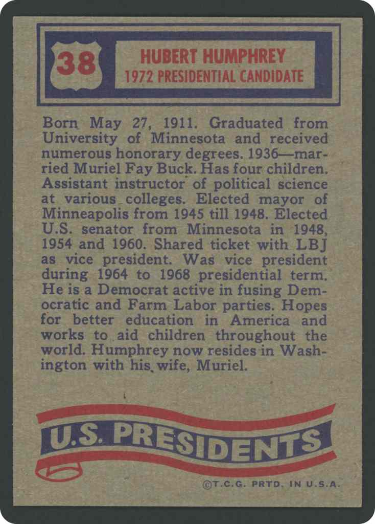 Born May 27, 1911. Graduated from University of Minnesota and received numerous honorary degrees. 1936 married Muriel Pay Buck. Has four children. Assistant instructor of political science at various colleges. Elected mayor of Minneapolis from 1945 till 1948. Elected U.S. senator from Minnesota in 1948, 1954 and 1960. Shared ticket with LBJ as vice president. Was vice president during 1964 to 1968 presidential term. He is a Democrat active in fusing Democratic and Farm Labor parties. Hopes for better education in America and works to aid children throughout the world. Humphrey now resides in Washington with his wife, Muriel.