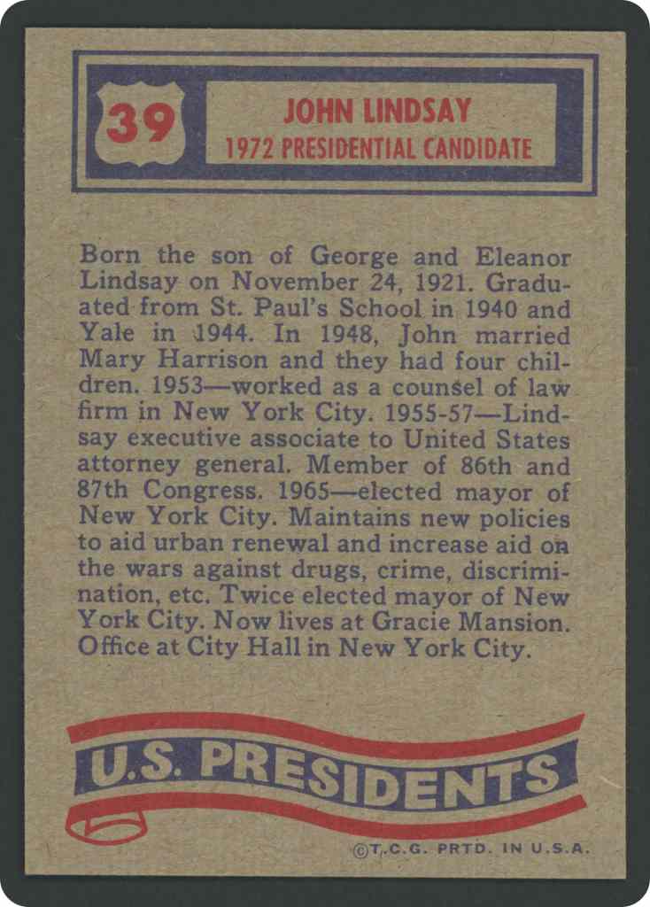 Born the son of George and Eleanor Lindsay on November 24, 1921. Graduated from St. Paul’s School in 1940 and Yale in 1944. In 1948, John married Mary Harrison and they had four children. 1953 worked as a counsel of law firm in New York City. 1955-57 Lindsay executive associate to United States attorney general. Member of 86th and 87th Congress. 1965- elected mayor of New York City. Maintains new policies to aid urban renewal and increase aid on the wars against drugs, crime, discrimination, etc. Twice elected mayor of New York City. Now lives at Gracie Mansion. Office at City Hall in New York City.