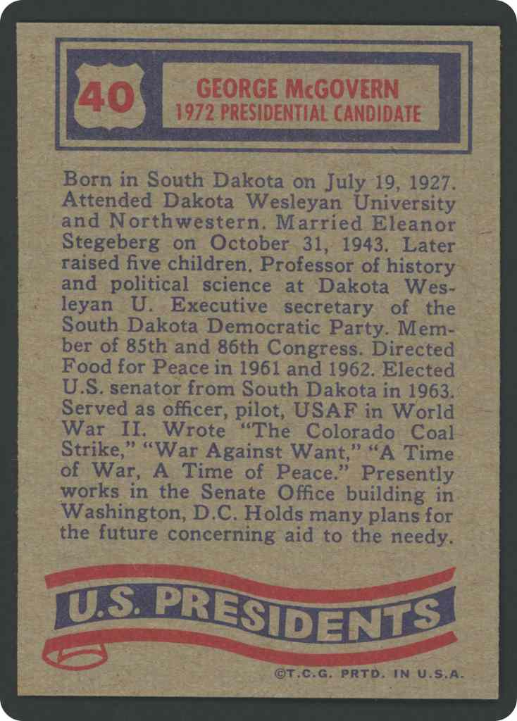 Born in South Dakota on July 19, 1927. Attended Dakota Wesleyan University and Northwestern. Married Eleanor Stegeberg on October 31, 1943. Later raised five children. Professor of history and political science at Dakota Wesleyan U. Executive secretary of the South Dakota Democratic Party. Member of 85th and 86th Congress. Directed Food for Peace in 1961 and 1962. Elected U.S. senator from South Dakota in 1963. Served as officer, pilot, USAF in World War II. Wrote “The Colorado, Coal Strike,” “War Against Want.” “A Time of War, A Time of Peace.” Presently works in the Senate Office building in Washington, D.C, Holds many plans for the future concerning aid to the needy.