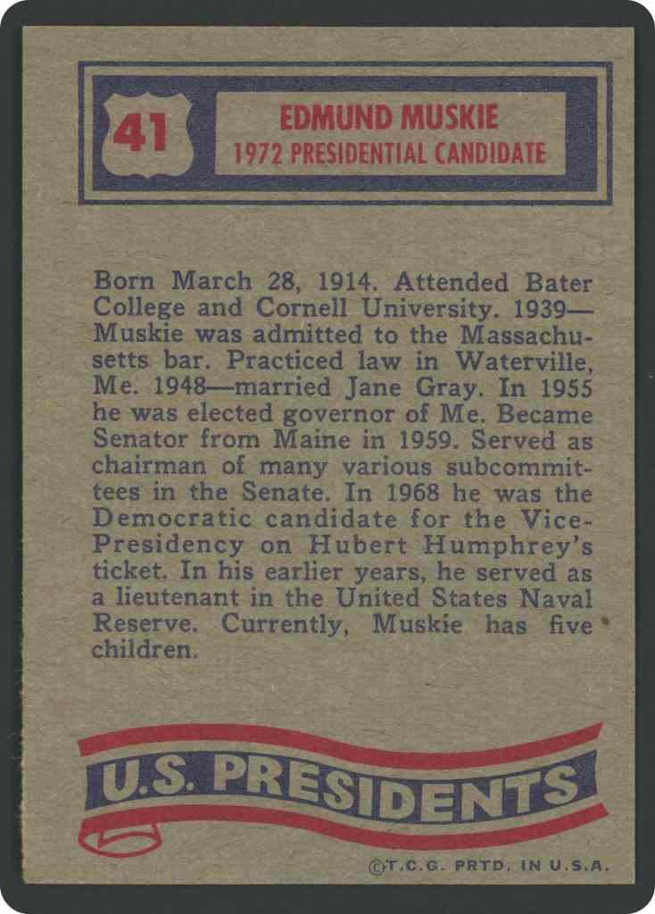 Born March 28, 1914. Attended Bater College and Cornell University. 1939 Muskie was admitted to the Massachusetts bar. Practiced law in Waterville, Me. 1948- married Jane Gray. In 1955 he was elected governor of Me. Became Senator from Maine in 1959. Served as ChaIrman OF many various subcommittees in the Senate. In 1968 he was the Democratic candidate for the Vice-Presidency on Hubert Humphrey’s ticket. In his earlier years, he served as a lieutenant in the United States Naval Reserve. Currently. Muskie has five children.