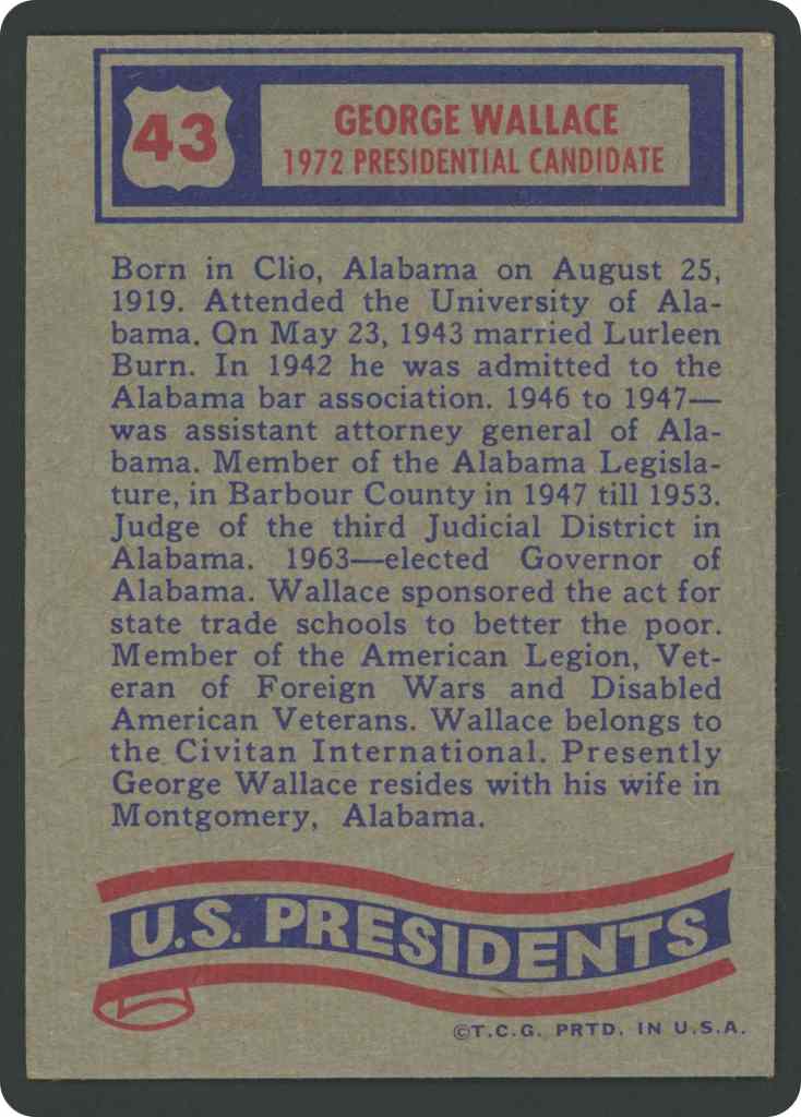 Born in Clio, Alabama on August 25, 1919. Attended the University of Alabama. On May 23, 1943 married Lurleen Burn. In 1942 he was admitted to the Alabama bar association. 1946 to 1947 was assistant attorney general of Alabama. Member of the Alabama Legislature, in Barbour County in 1947 till 1953. Judge of the third Judicial District in Alabama. 1963 elected Governor of Alabama. Wallace sponsored the act for state trade schools to better the poor. Member of the American Legion, Veteran of Foreign Wars and Disabled American Veterans. Wallace belongs to the Civitan International. Presently George Wallace resides with his wife in Montgomery, Alabama.