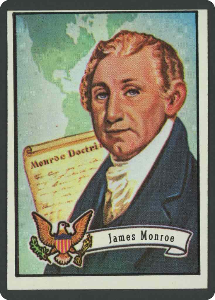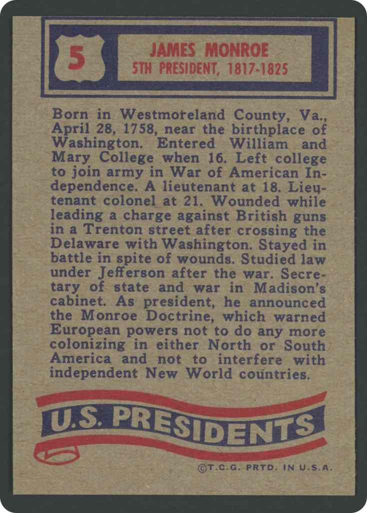 Born in Westmoreland County, Va., April 28, 1758, near the birthplace of Washington. Entered William and Mary College when 16. Left college to join army in War of American Independence. A lieutenant at 18. Lieutenant colonel at 21. Wounded while leading a charge against British guns in a Trenton street after crossing the Delaware with Washington. Stayed in battle in spite of wounds. Studied law under Jefferson after the war. Secretary of state and war in Madison’s cabinet. As president, he announced the Monroe Doctrine, which warned European powers not to do any more colonizing in either North or South America and not to interfere with independent New World countries.