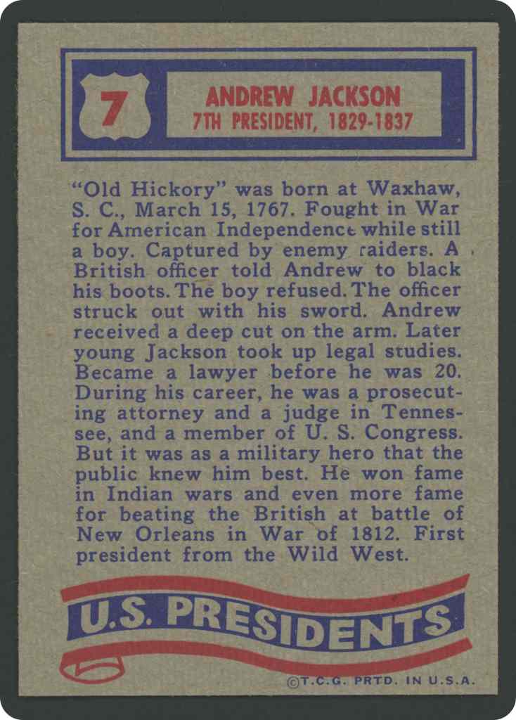 “Old Hickory” was born at Washaw, S. C. March 15, 1767. Fought in War for American Independence while still a boy. Captured by enemy raiders. A British officer told Andrew to black his boots. The boy refused. The officer struck out with his sword. Andrew received a deep cut on the arm. Later young Jackson took up legal studies. Became a lawyer before he was 20. During his career, he was a prosecuting attorney and a judge in Tennessee, and a member of U. S. Congress. But it was as a military hero that the public knew him best. He won fame in Indian wars and even more fame for beating the British at battle of New Orleans in War of 1812. First president from the Wild West.