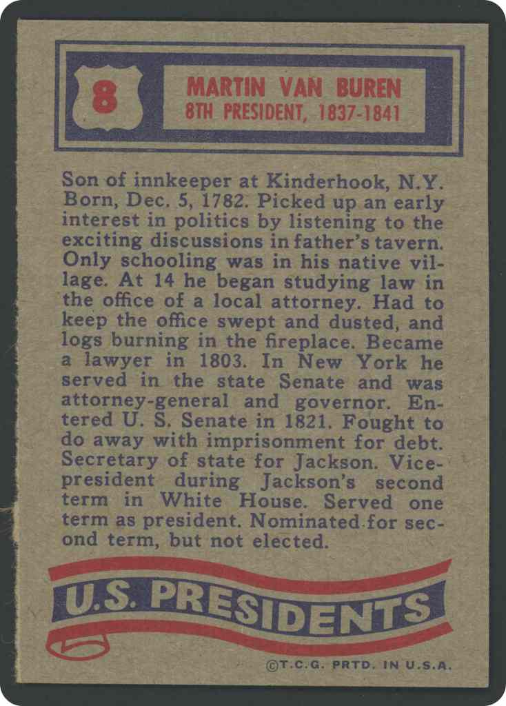 Son of innkeeper at Kinderhook, N.Y. Born, Dec. 5, 1782. Picked up an early interest in politics by listening to the exciting discussions in father’s tavern. Only schooling was in his native village. At 14 he began studying law in the office of a local attorney. Had to keep the office swept and dusted, and logs burning in the fireplace. Became a lawyer in 1803. In New York he served in the state Senate and was Attorney General and Governor. Entered U. S. Senate in 1821. Fought to do away with imprisonment for debt. Secretary of state for Jackson. Vice-President during Jackson’s second term in White House. Served one term as president. Nominated for second term, but not elected.