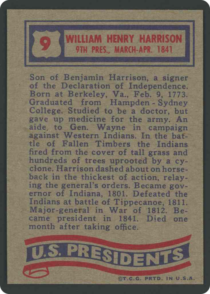 Son of Benjamin Harrison, a signer of the Declaration of Independence. Born at Berkeley, Va., Feb. 9, 1773, Graduated fromHamoden-Sydnev College. Studied to be a doctor, but gave up medicine for the army. An aide to Gen. Wayne in campaign against Western Indians. In the battle of Fallen Timbers the Indians fired from the cover of tall grass and hundreds of trees uprooted by a cyclone. Harrison dashed about on horse-back in the thickest of action, relaying the general’s orders. Became governor of Indiana, 1801. Defeated the Indians at battle of Tippecanoe, 1811. Major-general in War of 1812. Became president in 1841. Died one month after taking office.